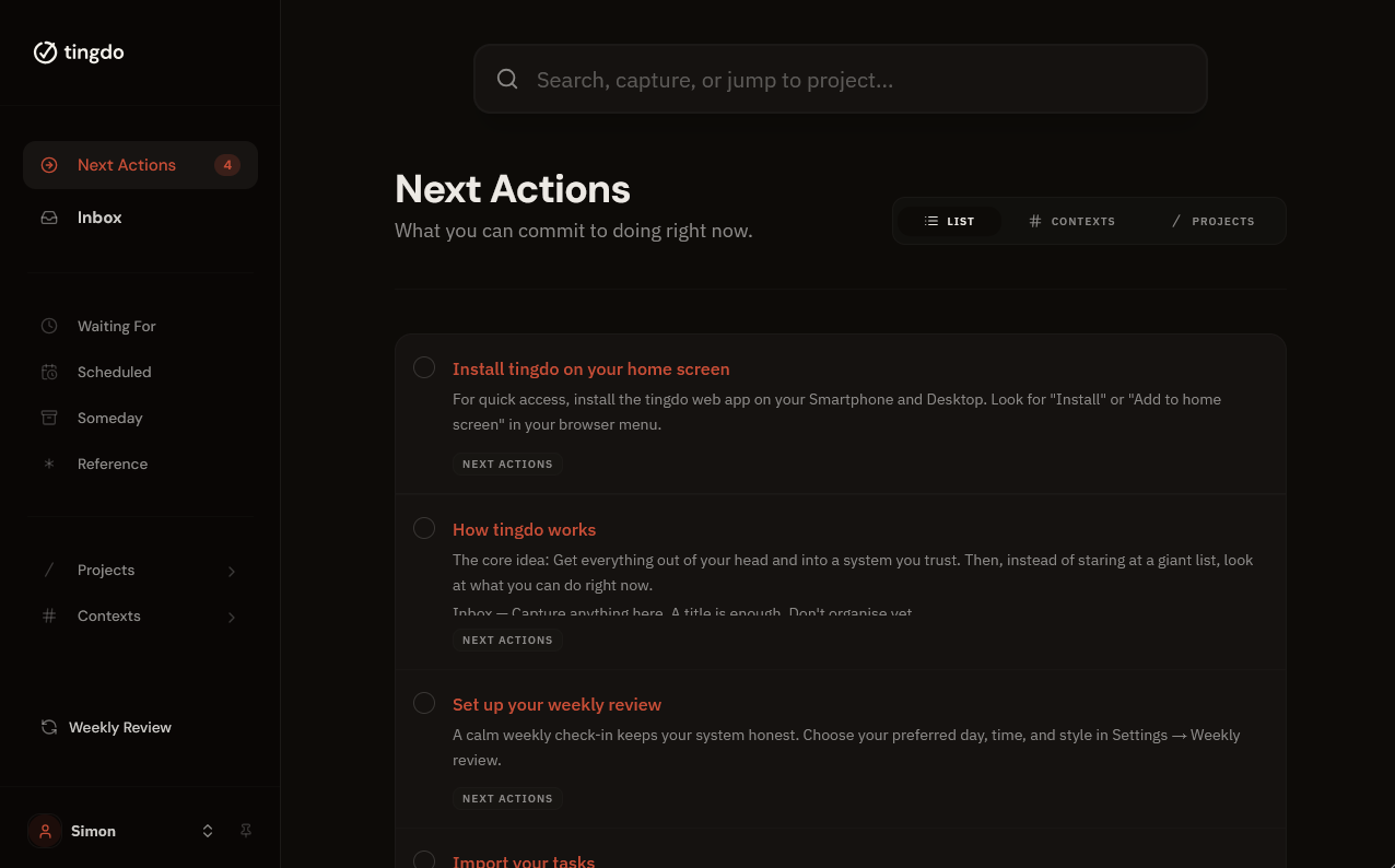 No clutter. No color-coded urgency. Your next actions, organized by context.